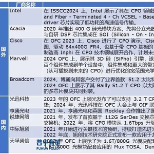 光模块厂商布局:头部光模块厂商敏锐捕捉到 CPO 技术的发展机遇,近几年相继推出共封装光学 CPO 方案,在技术研发和产品创新方面持续发力。光通信上下游产业链厂商如联特科技、锐捷网络、旭创、通宇通讯、中京电子、天孚通信、罗博特科、新易盛、光迅科技、德科立、仕佳光子、亨通光电、剑桥科技、博创科技等多家企业也纷纷透露有 CPO 相关技术研发或业务布局,涵盖了从芯片制造、模块封装到系统集成等各个环节,形成了较为完整的产业链生态,共同推动着 CPO 技术的产业化发展和应用普及。