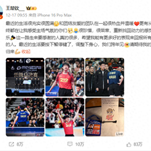 12月17日,王楚钦在个人社媒晒出多张此次乒超联赛赛场照片,并发文总结称,“最近的生活很充实很圆满,和团结友爱的团队在一起很热血并温暖,更有从始至终都在让我感受主场气氛的你们……最近的生活要按下暂停键了,调整下身心,我们跨年见,请期待我的满血归来。”