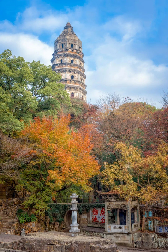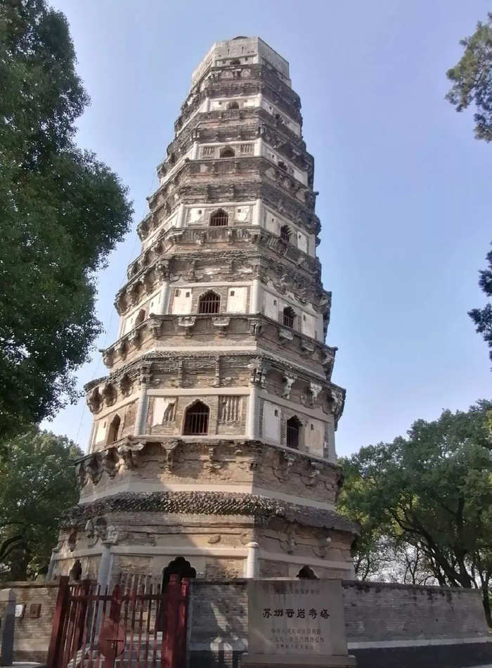云岩寺塔又称虎丘塔,现存塔身建成于北宋建隆二年(公元961年),七级八面,高47.7米,斜而不倒,是10世纪长江流域砖塔的代表作,也是苏州古城的地标之一,1961年被国务院公布为第一批全国重点文物保护单位。