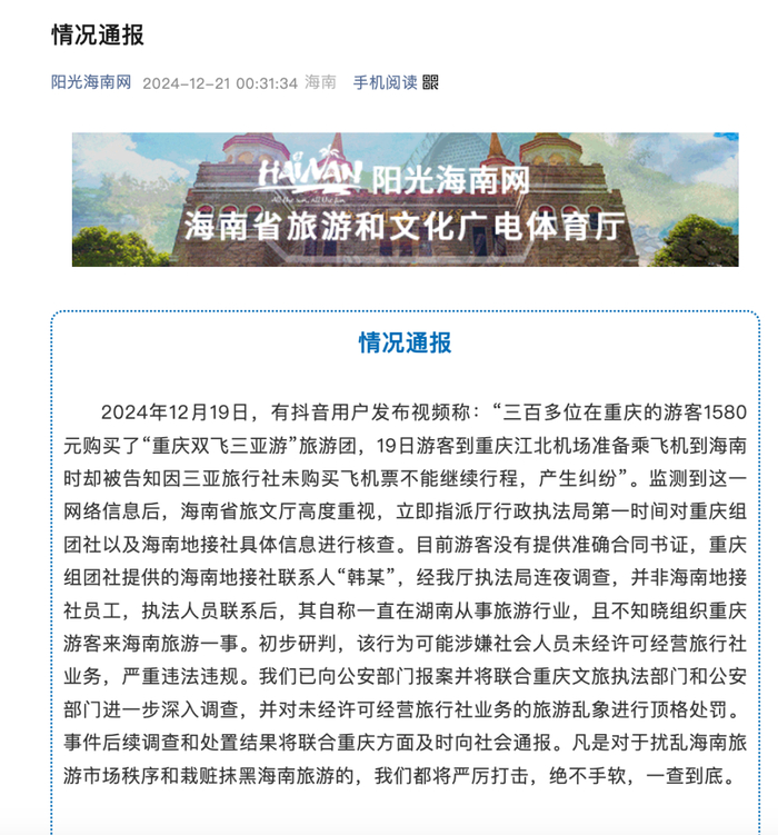 12月21日凌晨,海南省旅游和文化广电体育厅发布情况通报称,重庆组团社提供的海南地接社联系人“韩某”,经查并非海南地接社员工。该行为可能涉嫌社会人员未经许可经营旅行社业务,已向公安部门报案并将联合重庆文旅执法部门和公安部门进一步深入调查。