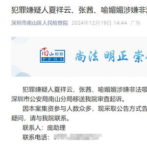 12月19日,深圳市南山区人民检察院发布通报称,犯罪嫌疑人夏祥云、张茜、喻媚媚涉嫌非法吸收公众存款罪一案,已于近日由深圳市公安局南山分局移送我院审查起诉。
