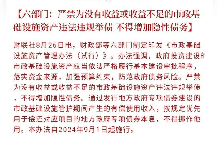 其次,今年8月,财政部、住建部、工信部、公安部、交通部、水利部等六部门联合发布了《市政基础设施资产管理办法(试行)》,其中提到了严禁为没有收益或收益不足的市政基础设施资产违法违规举债。这里的“市政设施”,就包括地铁、有轨电车、城市道路、城市桥梁、能源设施等。 该文件自2024年9月1日起正式施行。