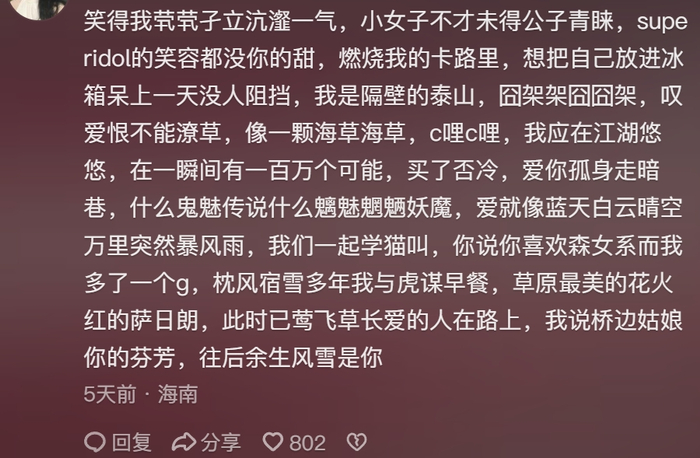 已经不满足于只模仿“小生”“小女子”,还旁征博引地把许多无关的歌词梗、抽象梗也进行了引进,天下抽象一大家。