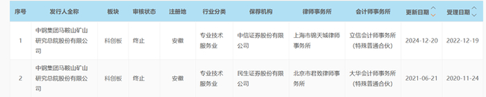 中钢矿院第一次科创板IPO于2020年11月24日受理,保荐机构为民生证券,2021年6月撤回IPO申请;此后,其更换保荐机构为中信证券,第二次科创板IPO于2022年12月19日受理,并于2024年12月撤回IPO申请。