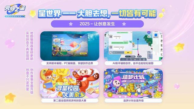 2025年,操作更高效的PC编辑器即将上线;未来能通过“脚本编程”产出玩法更丰富、性能更高的星世界地图;还有“AI助手”功能,将助力造梦师大幅降低创作难度!