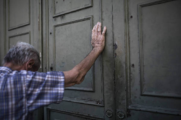 2015年7月7日,在希腊首都雅典,一名退休老人倚靠在希腊国民银行门外等待取款。新华社