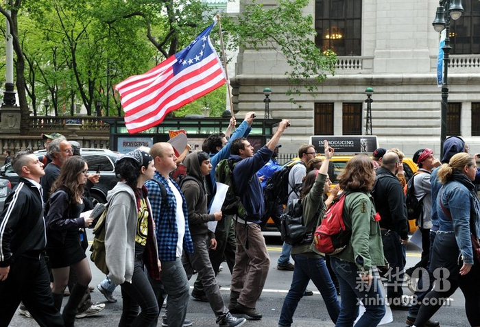 2012年5月1日,“占领华尔街”运动抗议者在纽约曼哈顿街头进行抗议活动。