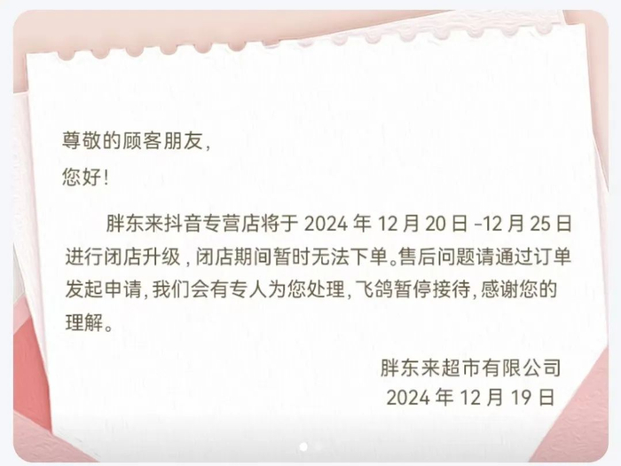 近日,胖东来超市发布公告,将部分商品调整为线上销售。目前,胖东来线上两店铺正在闭店升级,将于升级完成后第一时间开放。