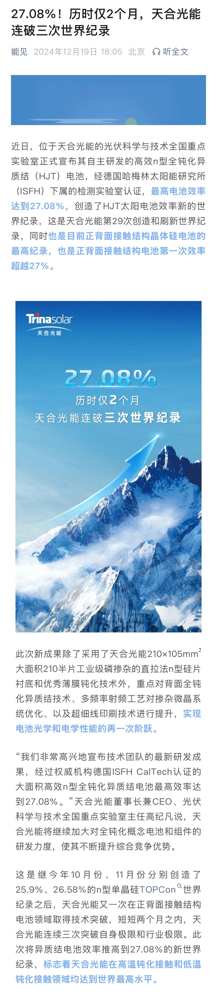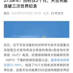 近日,位于天合光能的光伏科学与技术全国重点实验室正式宣布其自主研发的高效n型全钝化异质结(HJT)电池,经德国哈梅林太阳能研究所(ISFH)下属的检测实验室认证,最高电池效率达到27.08%,创造了HJT太阳电池效率新的世界纪录,这是天合光能第29次创造和刷新世界纪录,同时也是目前正背面接触结构晶体硅电池的最高纪录,也是正背面接触结构电池第一次效率超越27%。受到能源严究院、能见、SOLARZOOM光储亿家、摩尔光伏等众多行业媒体关注报道。