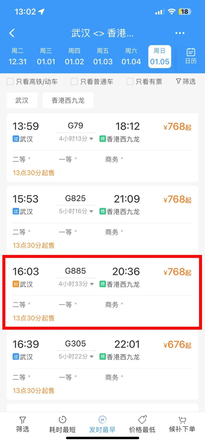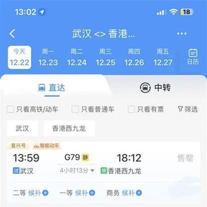极目新闻记者在12306APP看到,目前,武汉站到香港西九龙站,每天只有2趟高铁,分别是北京西—香港西九龙经停武汉,天津西—香港西九龙经停武汉。1月5日起将增加到4趟,除了新增一趟武汉站始发(16:03武汉站开,20:36香港西九龙到)的列车外,另一趟新增的是西安北—香港西九龙经停武汉。