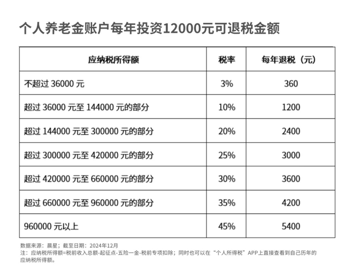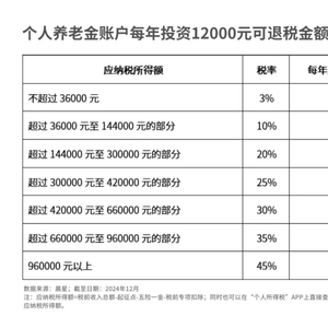 2024年行将结束,个人养老金投资第二个完整年份的所得税抵税优惠申报,进入倒计时。根据机构分析,按照应纳税所得额不同,个人养老金投资者对应的税率在3%至45%之间,年退税额从360元至5400元不等。
