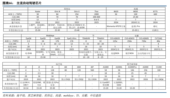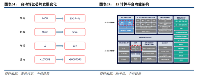 自动驾驶芯片以“CPU+GPU+NPU”的SoC异构方案为主,核心在NPU和ISP/DSP。传统的汽车电子芯片为MCU,多依赖于单一CPU处理器,但面对复杂的自动驾驶任务,CPU显得力不从心。目前自动驾驶芯片结构是以“CPU+GPU+NPU”的SoC异构方案为主,结合了通用计算、图形加速和专用加速的优势,能够高效处理自动驾驶中的海量数据和复杂算法,满足实时性和准确性的要求。自动驾驶芯片要完成瞬时处理、反馈、决策规划、执行的效果,对NPU算力要求非常高。自动驾驶级别每升高一级,对计算力的需求至少增加十倍。L2级别至少需要数十TOPS的算力,L3需要数百TOPS的算力,L4为数千TOPS。ISP是图像信号处理的核心芯片,负责前期的数据准备和图像预处理,以确保输入数据的质量;ISP生成的图像数据需要经过DSP进一步处理,DSP则可以进行更高级的图像处理,如目标检测、道路检测等应用。