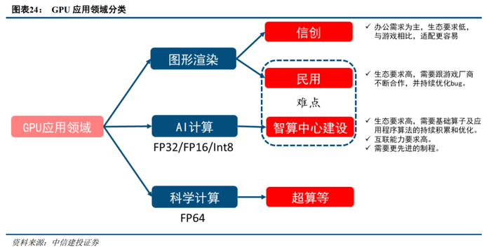 GPU具备图形渲染和并行计算两大核心功能。GPU具有数量众多的运算单元,适合计算密集、易于并行的程序,一般作为协处理器负责图形渲染和并行计算。对于国内来说,民用图形渲染领域买单的人是游戏爱好者,GPU公司需要跟大型游戏厂商进行适配合作,背后的生态支持需要大量工作。对于智算领域,生态要求极高,需要基础算子及应用程序算法的持续积累和优化,英伟达的CUDA具备绝对的生态优势,其次互联能力要求也极高,并且由于海外对国内使用先进制程有诸多限制,也限制了国内AI芯片的迭代。