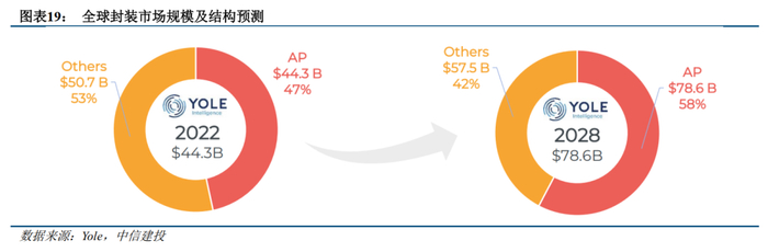 预计2028年全球先进封装市场规模增至786亿美元,2022-2028年CAGR达到10.0%。根据Yole数据,2022年全球封装市场中,先进封装占比已达到47%。预计到2028年,先进封装市场占比将增至58%,规模约为786亿美元,2022年-2028年CAGR约为10.0%,明显高于传统封装市场的2.1%和市场整体的6.2%。