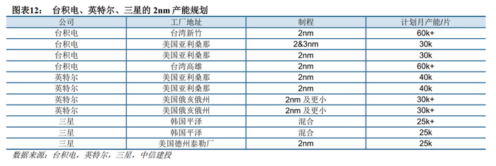 在2nm制程领域,预计台积电市占率将达4成以上,英特尔达3成以上。目前2nm的主要玩家包括台积电、英特尔和三星,台积电将在位于台湾新竹和高雄的工厂增加2nm产能,亚利桑那州的两个晶圆厂也将增加2nm产能。英特尔在亚利桑那州新建两个2nm晶圆厂,在俄亥俄州的两个晶圆厂也将提供支持。三星可能会在韩国和美国的晶圆厂增加2nm产线。根据产能规划,预计将来在2nm制程领域,台积电产能将占40%以上,英特尔占30%以上。