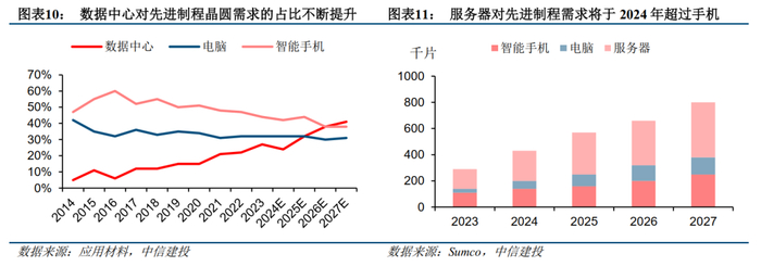 服务器需求将超过智能手机成为先进制程最主要的驱动力。历史上,智能手机的迭代更新推动了芯片制程的不断演进,但随着AI应用的计算需求上升,服务器成为主要的算力中心,且对高算力的追求使得其对先进制程呈现出越来越高的需求,AI芯片功耗较高,且需要更小的尺寸,因此AI芯片对先进制程的迫切需求将推动服务器需求成为先进制程最大的驱动力。Sumco估计,在AI服务器出货量强劲增长的推动下,服务器对先进制程晶圆的需求量最快将在今年超过智能手机。