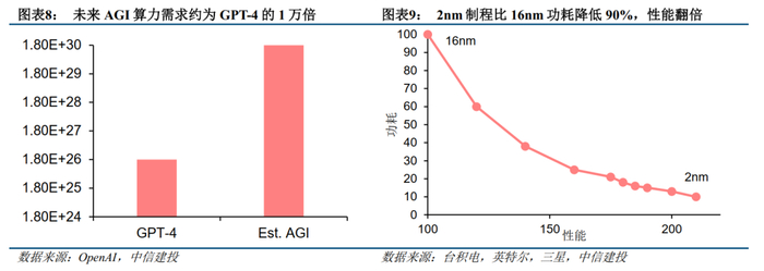 制程迭代是芯片算力提升的关键因素,AI算力需求的爆发催生了对先进制程的强需求。AI大模型发展对芯片算力提出更高要求,未来更成熟的AGI模型所需算力是现在GPT-4所需算力的1万倍。而解决高算力需求的一种方案是采用更为先进制程的芯片,因为芯片制程越先进,功耗越低、计算速度越快。如2nm芯片功耗约为16nm芯片的10%,而性能约为16nm芯片的2倍以上。台积电估计其即将推出的N2P节点的功耗可能比N3E节点低30-40%。目前头部Fab厂下一个最先进的工艺节点均为2nm,如台积电计划将其2nm工艺于2025年下半年投产,三星计划在2025年实现移动应用领域的2nm量产,英特尔等效台积电2nm芯片工艺Intel 20A预计2026年量产。