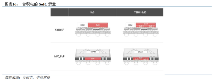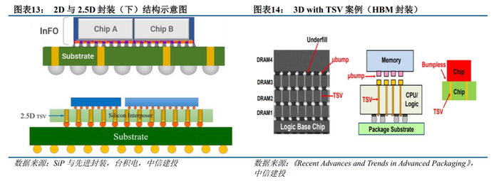 3D封装通常特指芯片通过TSV直接进行高密度互连,典型的案例即HBM。同时3D封装也包括3D without TSV:虽然多颗芯片在物理结构上呈现3D堆叠形态,但其电气互连上均需要通过基板(除极少数通过键合线直接连接的键合点),即先通过键合线/凸点连接到基板,然后在基板上进行电气互连,而非TSV。在某些场景下,此类集成也被归类为2D+集成以与3D TSV进行区分,典型案例即TSMC的InFO_PoP。