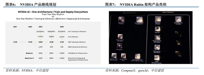 继Blackwell之后,Nvidia Rubin平台于2024年6月Computex大会上亮相。该平台具有新的GPU架构、新的ARM架构CPU Vera、新的HBM4存储颗粒、覆盖12颗HBM4的更大尺寸CoWoS封装,以及NVLink6、CX9 SuperNIC网卡和新一代融合IB网络与以太网的新型交换机X1600。