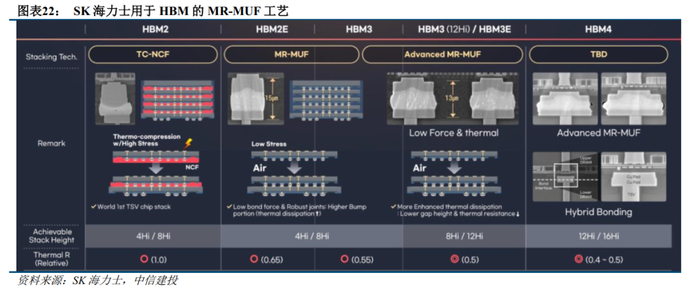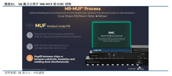 (2)MR-MUF:将半导体芯片堆叠起来,并将液体保护材料注入芯片之间的空间,然后硬化以保护芯片和周围电路的工艺。与在每个芯片堆叠后应用薄膜型材料相比,MR-MUF是一种更高效的工艺,并提供有效的散热。目前SK海力士主要使用MR-MUF工艺生产HBM2e/3/3e,使得其领先于三星电子和美光,后者主要采用TC-NCF工艺。MR-MUF工艺需要使用液态环氧树脂(EMC),目前全球仅日本namics独供。除EMC外,HBM封装还需要底部填充胶用于FC工艺,采用PSPI作为硅中介层中RDL的再钝化层,还需要IC载板、DAF、Solder ball等材料。