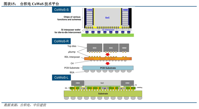 CoWoS为HPC和AI计算领域广泛使用的2.5D封装技术。台积电早在2011年推出CoWoS技术,并在2012年首先应用于Xilinx的FPGA上。此后,华为海思、英伟达、谷歌等厂商的芯片均采用了CoWoS,例如GP100(P100显卡核心),TPU 2.0。如今CoWoS已成为HPC和AI计算领域广泛应用的2.5D封装技术,绝大多数使用HBM的高性能芯片,包括大部分创企的AI训练芯片都应用CoWoS技术。