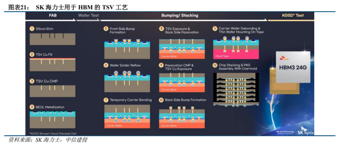 从HBM的生产工艺来看,DRAM颗粒为定制的DRAM颗粒,工艺难点在于封测。TSV、大规模回流模塑底部填充(MR-MUF)、自对准、混合键合等工艺很大程度上影响HBM的性能和良率。
