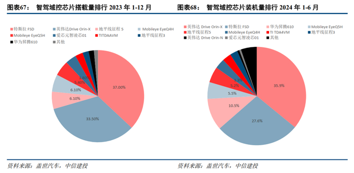 外资芯片占比较高,自主厂商逐渐起量。根据盖世汽车的数据显示,2023年智驾域控芯片搭载量排名前四的分别是特斯拉FSD芯片、英伟达Orin、Mobileye EyeQ4H和Mobileye EyeQ5H,装机量分别为:1,208,402颗、1,147,311颗、201,437颗和175,246颗,对应市场份额分别为34.4%、32.6%、5.7%和5%。特斯拉FSD和英伟达Orin占比近七成。自主厂商也在不断突围。地平线、华为等厂商紧随英伟达、特斯拉其后,2023年地平线出货量20万颗,市占率为6.1%,位列第三,2024年上半年华为以10.5%市场份额位列第三。