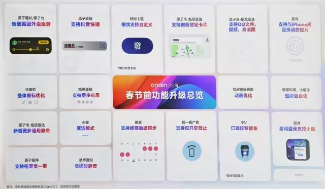 如上图所见,OriginOS 5春节前功能升级包括:原子通知/原子岛新增美团外卖服务、原子通知支持抖音快递、原子组件支持拖至负一屏、原子岛-拖放直达支持微信地址卡片、原子岛-拖放直达支持QQ文件视频/高清图、互传-支持与iPhone间互传动态照片、轻尚主题-指纹支持自定义、熄屏通知-支持更多应用、录屏通知-勿扰时静音、状态栏-整体图标优化、锁屏密码界面-动画优化、锁屏时间/小组件-透彩色优化、小窗-简洁模式、健康-支持经期数据同步、摇一摇广告支持仅在开屏时禁止、游戏登录支持小窗、小V-订咖啡智能体一句话点咖啡等。