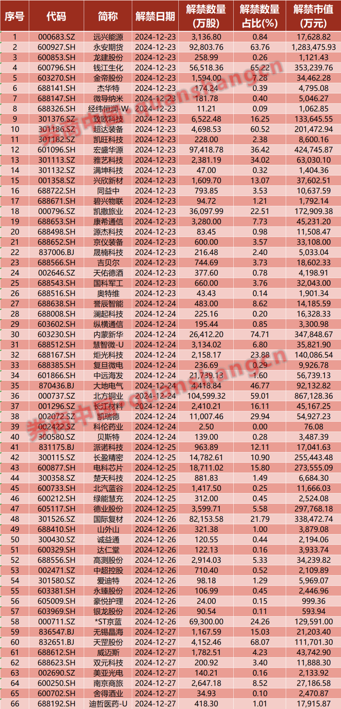 本周(12月23日至27日),A股市场将有66家上市公司迎来限售股解禁。以个股最新价计算,66家上市公司解禁股对应市值合计622.28亿元。从解禁规模上看,永安期货居首,解禁市值128.35亿元;北方铜业位于次席,解禁市值86.71亿元。