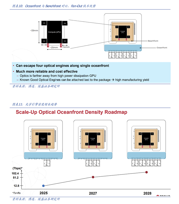 而从scale up角度来看,当前XPU或者GPU上的光口只有一个,而随着传输速率要求的不断提升,未来单一XPU上的光接口数量可能会持续提升,博通给出了oceanfront即光引擎的拓展思路:
