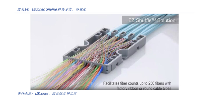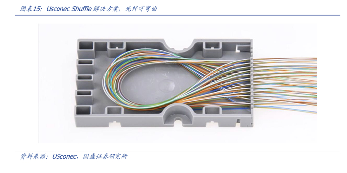 使用预组装光纤盒是另一种方法,可以减少下游盒级组装人员对光纤处理不当的可能性,shuffle方案。参考Usconec shuffle给出的方案,将256跟光纤进行重分配定位,为客户提供更加简单快捷的布线方案。Shuffle产品由于光纤密度极高,对于生产工艺和精确度有着极高的要求,目前正在AI数据中心领域加速落地。