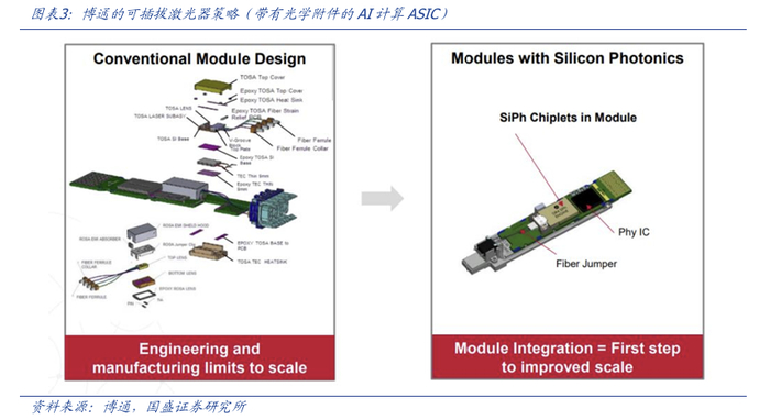 模块化设计:Known Good Optical Engines(经过验证的光引擎模块)可以最后阶段安装到封装上,这种模块化方式提高了制造良率并降低了成本。