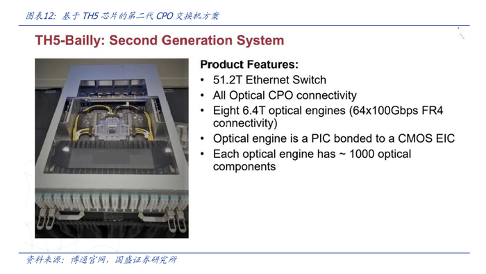 光互联开始向机柜内渗透。CPO方案首先在交换机层面带来了很明显的变化,我们参考博通给出的基于TH5芯片的第二代CPO交换机方案,通过将光引擎封装在交换机芯片内部,内部从光引擎出来的信号均为光信号,新增了大量光纤相关配套产品实现光互联。从交换机内部开始变以光作为主要信息的传递形态,光在交换机内进行了新一轮的渗透。