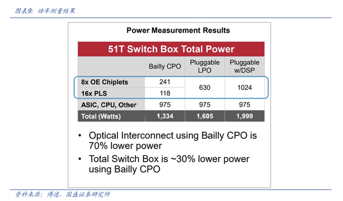 我们参考博通给出的功耗比较,主要对比CPO方案、去掉DSP的LPO方案以及传统带DSP的可插拔方案,其中总功耗分别由光电芯片组、光模块和ASIC构成,CPO方案总功耗1334W,LPO方案为1605W,传统方案为1999W,CPO方案相较于传统带DSP的可插拔光模块方案,光互联功耗降低70%,总功耗降低30%,相较于LPO方案,也有接近17%的功耗优势。