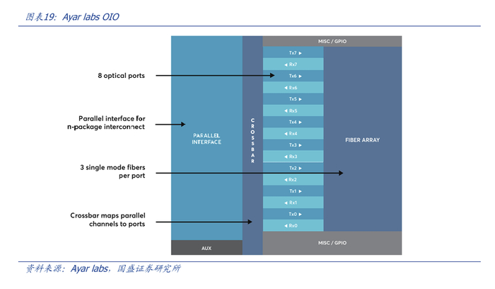 目前在OIO领域,Ayar labs是一家具有代表性的初创企业,我们参考其给出的方案,中间是GPU或其他核心芯片,节奏在两旁Ayar labs的OIO与其紧密封装在一起,最外部是光接口及光纤。GPU内的信号是电信号,OIO则负责进行光电转换,将GPU的电信号转换成光信号对外输出,或将外部收到的光信号转换成电信号传送给GPU处理。可以看到OIO的作用与光模块在功能上是一样的,负责进行光电转换。
