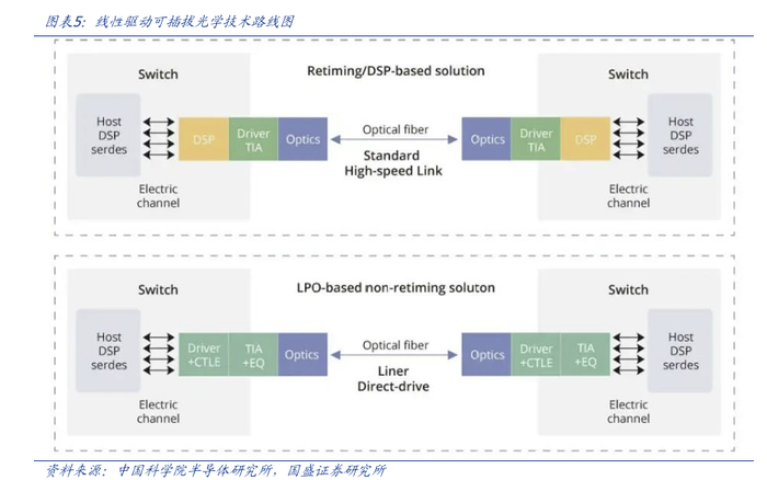 LPO的去DSP,是真正不想在光模块中的电芯片中加DSP,而是将DSP功能放在系统设备侧来实现。图表5更直观的展示了传统基于DSP/Retiming方案与LPO方案的异同。在接口方面,LPO对模块本体的封装没有要求,不管是QSFP,还是QSFP-DD,亦或是OSFP、OSFPXD等均可以实现LPO方案。
