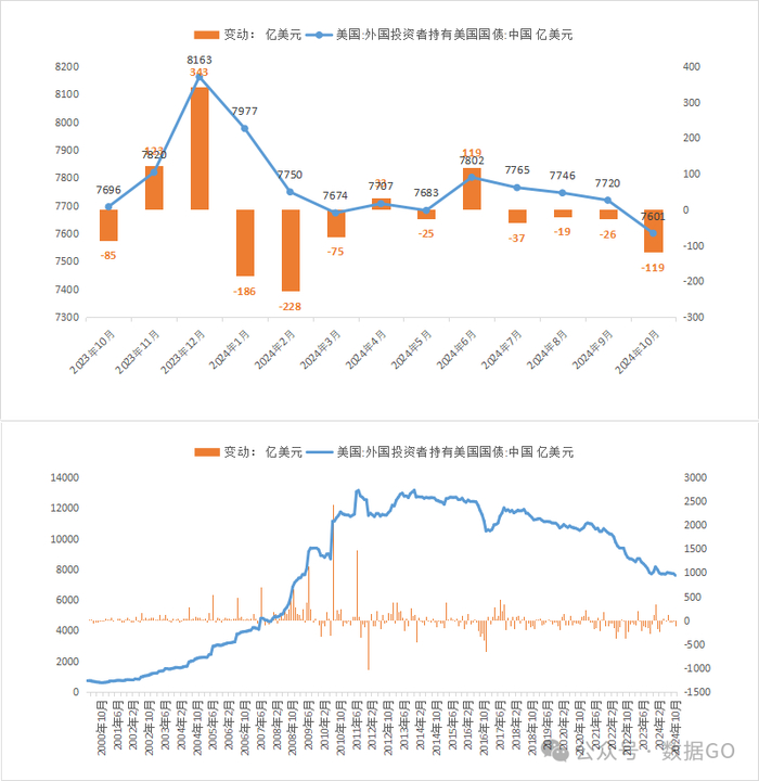 官方数据显示,截止到2024年10月份,外国投资者持有美国国债市值减少772亿美元,总数为8.60万亿美元,连续8个月稳定在8万亿美元之上。单月减少市值是2023年9月以来最高。