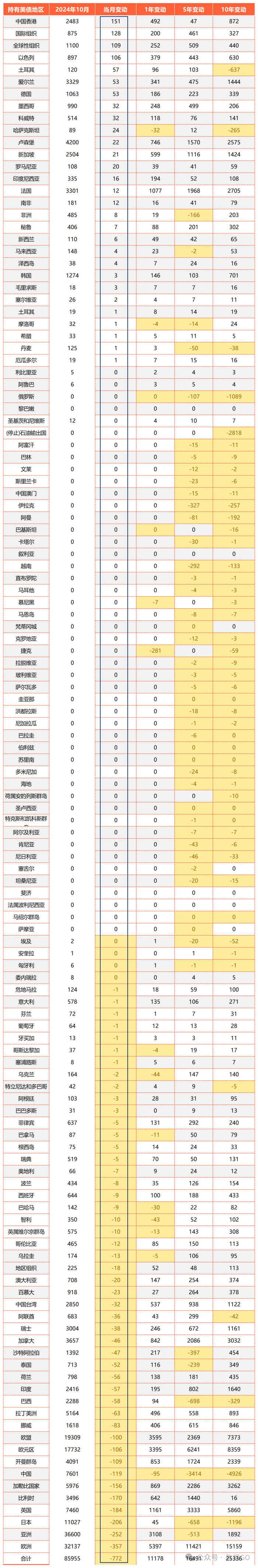 表:各地区持有美债市值变动排名(2024年10月,单位:亿美元)