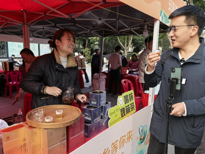 在福建安溪岐山魏荫名茶有限公司摊位上,“喝杯魏荫茶”的标语吸引了主播的注意。