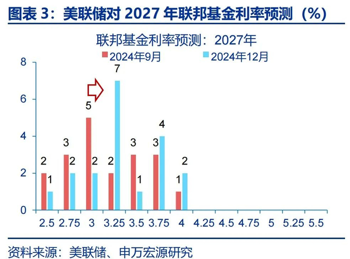 基于经济、点阵图预测、声明,以及鲍威尔表态,美联储未来可能放缓降息步伐。上文我们提到美联储下修了2025年降息空间,这实际上已经指向未来降息步伐可能是趋缓的。此外,在声明中,美联储新增考虑未来利率调整的“程度”和“时机”。在记者会上,鲍威尔亦给出了两条线索:1)部分委员在通胀预测中已将未来潜在特朗普政策纳入考虑;2)美联储在利率调整中已经处于一个新的“阶段”,今后降息需要看到通胀的更多进展,美联储可以变得更为谨慎。