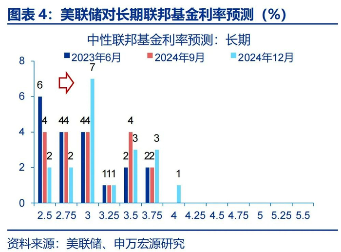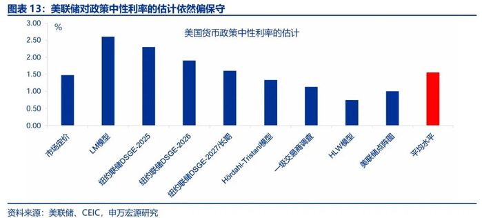 从中性利率角度,美联储降息终点可能在哪里?美联储目前对于中性利率(实际)的估计偏保守(按照最新点阵图,1%),参考市场定价的中性利率(1.5%),如果明年PCE通胀中枢为2.5%,理论上FFR或难下降至4%以下,但未来在面对经济风险时,不排除出现超调的可能性。