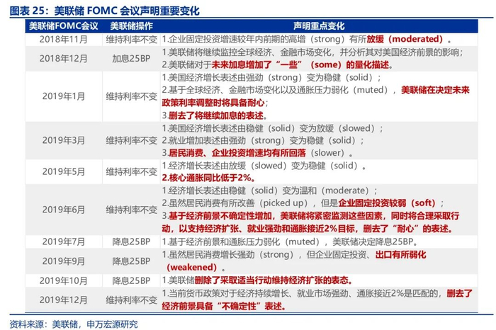 伴随着美联储立场转鸽,美联储由2018年的加息转为2019年连续三次降息。2019年7月美联储开启“预防式”降息的三大逻辑:应对贸易政策不确定性、全球经济走弱,并推动通胀更快回到2%以上,三者均可在前期美联储书面文件中观察到线索。1)美联储加息进程逆转,美联储上一轮加息进程自2015年12月开启,2016、2017、2018年分别加息1次、3次、4次,随后2019年转为降息3次,是为“中周期调整”(Mid-Cycle Adjustments)。2)贸易政策不确定性+全球经济放缓方面。美联储声明中最早在2018年11月将企业固定投资增速的描述由强劲(strong)变为放缓(moderated),2019年3月会议变为回落(slower),2019年6月会议变为较弱(soft),并在2019年9月第二次降息的时点改为投资和出口弱化(weakened)。3)通胀方面,2019年1月会议声明中美联储首次提到通胀压力弱化(muted),2019年5月声明中对核心通胀的表述由接近2%变为低于2%。