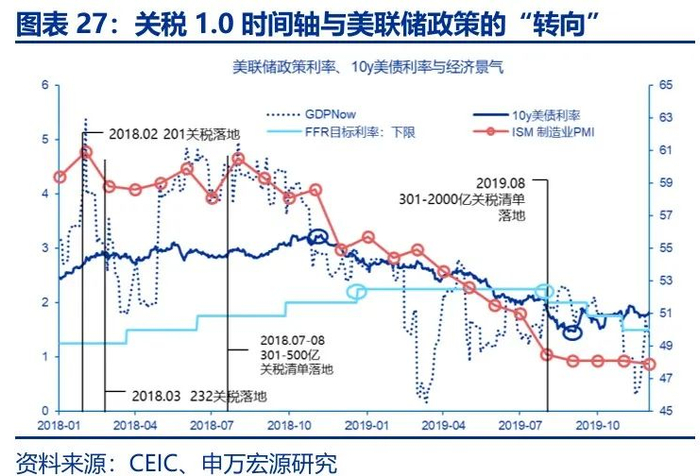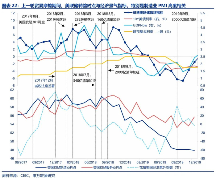 美联储立场转鸽的时间点是在2018年7-9月三批301关税落地之后,与经济景气走弱高度相关。从经济指标上,能够观察到在2018年期间,花旗美国经济意外指数(软指标)在此期间回落,主因TCJA减税法案通过之后的预期回调。在2018年1-8月期间,美国ISM制造业、服务业PMI均维持在55以上的高景气范围。但在301关税逐步落地的过程中,美国ISM制造业PMI开始下行,从2018年8月的60.5下滑至2019年8月的50以下,高度对应从关税落地,美联储停止加息,到开启降息的转变。无独有偶,从GDPNow(亚特兰大联储实时GDP)来看,美国经济增速从2018年前三季度3.8%的平均增速回落至2018Q4的2.7%,并进一步在2019Q1回落至2.1%,跌破2018年初的最低点,也能对应美联储的转鸽时点。