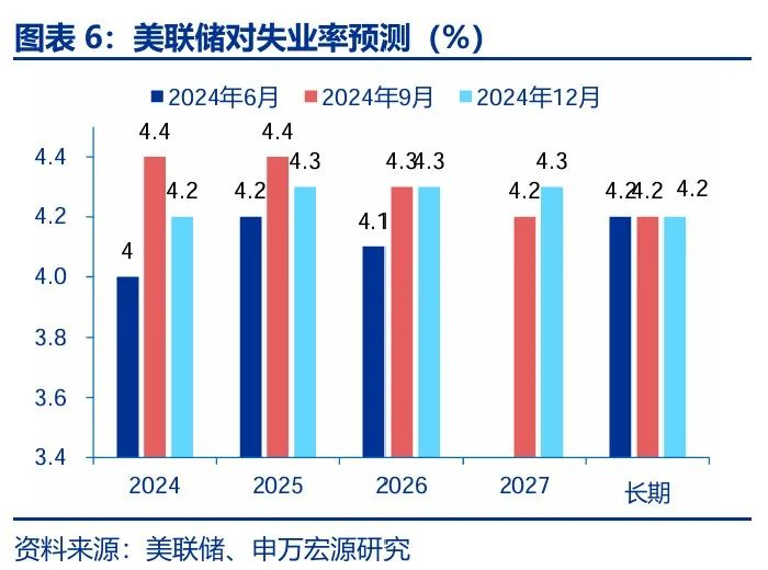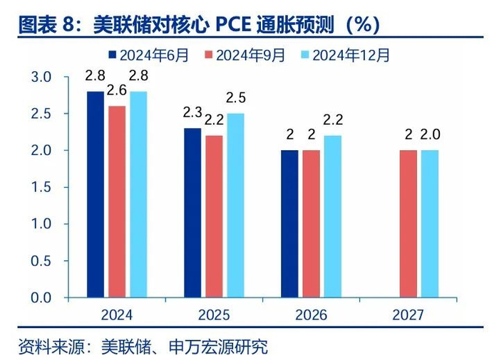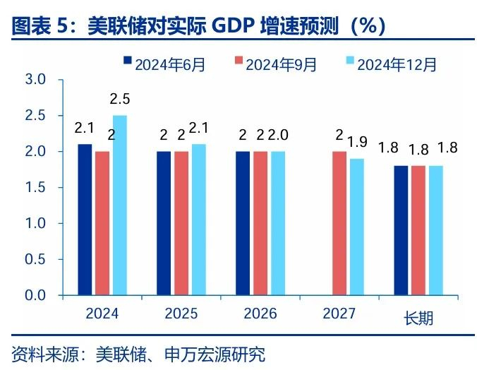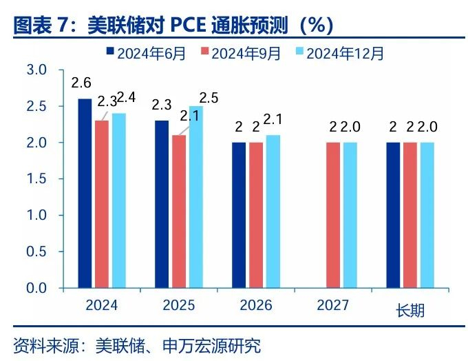 美联储为何下修2025年降息空间?更高通胀、更强经济、更靠近中性利率。此次会议最大的增量信息来自于美联储下修了2025年降息空间,从9月的4次降息(100BP)指引下调为了2次降息(50BP)至3.9%,美联储的论据来自于三方面,分别为更高通胀、更强经济、更接近中性利率,这三者均体现在美联储经济预测摘要中,特别是美联储将长期联邦基金利率预测从2.9%上修至3.0%。具体来看,美联储此次将2024、2025年实际GDP增速预测分别上修0.5、0.1个百分点至2.5%、2.1%,将2024、2025年失业率预测分别下修0.2、0.1个百分点至4.2%、4.3%,将2024、2025、2026年核心PCE通胀预测分别上修0.2、0.3、0.2个百分点至2.8%、2.5%、2.2%,将2024、2025、2026年整体PCE通胀预测分别上修至2.4%、2.5%、2.1%。