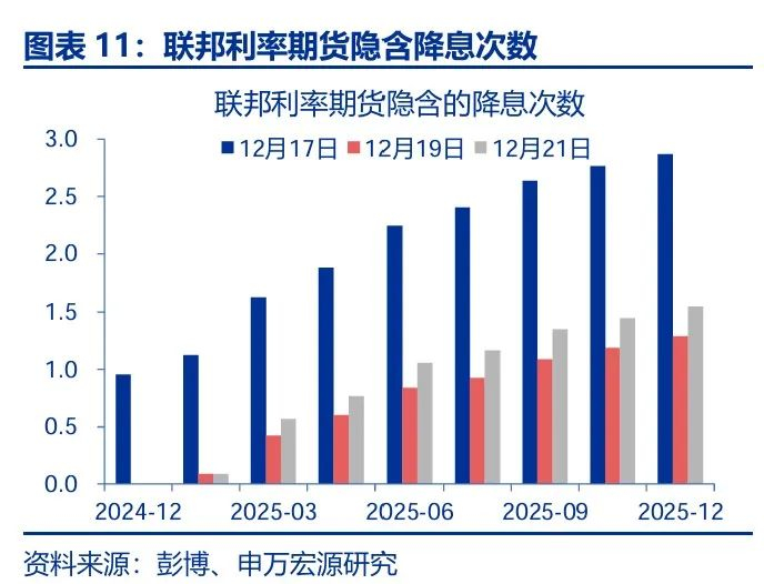 12月FOMC例会,美联储的“鹰派”立场超市场预期。会后,市场定价的2025年降息次数下降到1.5次。如果考虑特朗普关税2.0,市场或低估了2025年美联储降息的空间。