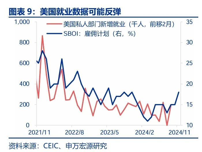短期来看,美联储放缓降息确有经济基础。近期美国经济仍然保持强劲,例如11月零售数据环比达0.7%,远强于市场预期。同时,从短期领先指标来看,美国小企业雇佣计划指数出现反弹,可能意味着美国就业数据表现将会较强。进一步看,最近几个月美国通胀数据出现一定反弹,虽然有基数效应影响,但是耐用品通胀、核心非房租服务通胀表现不弱,实际上反映的是美国经济仍然较为健康,居民财富效应仍然有效。基于美国通胀和经济的短期趋势,的确美联储在短期内具备放缓降息的基础。