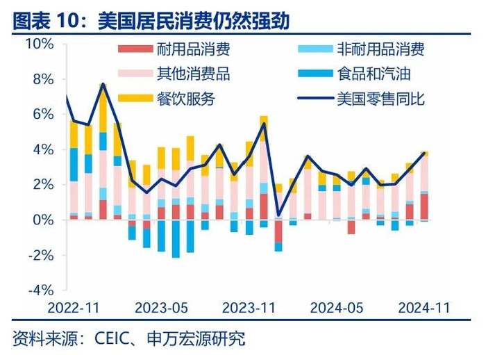 如果考虑关税2.0的影响,明年美联储的降息空间或高于当前市场一致预期。当前美国经济正处在从超常增速(2.5%+)向正常增速(2.0%左右)收敛的过程。关税2.0的宏观含义依次为:落地前的通胀预期、落地后的温和滞胀、一段时间后经济下行风险占优。