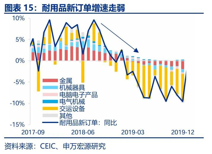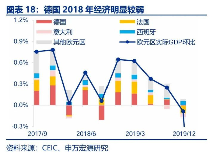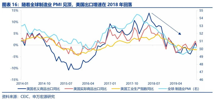 2018年初以来,特朗普政府依据201、232、301条款对进口商品加征关税,以收缩贸易赤字、降低对外经济依赖度,强化经济安全。2018-2019年期间,美国企业投资、出口增速走弱,受关税、全球外需走弱影响较大。1)从企业投资来看,美国GDP设备投资在2018-2019年期间波折走弱,耐用品订单增速从2018年三季度的10%左右回落至2019年的接近-10%,与美联储2018年11月首次提到企业固定投资走弱对应。2)全球制造业PMI在2018年初开始回落,这导致美国出口增速从2018年中旬开始回落,但全球外需的走弱,很大程度上也和特朗普1.0关税政策相关,如中国进口、出口增速均在2018年中旬之后回落,欧元区中德国经济在2018年表现明显较弱。