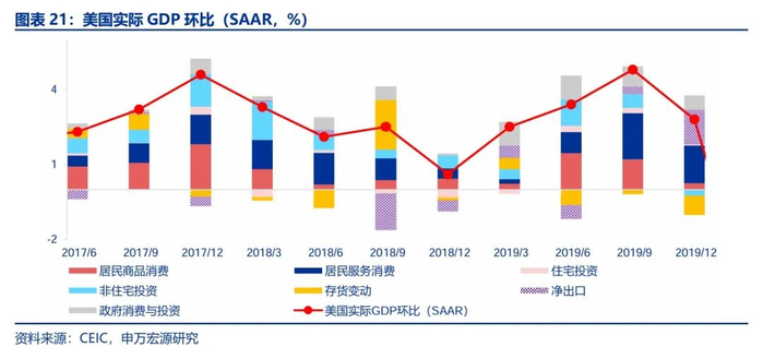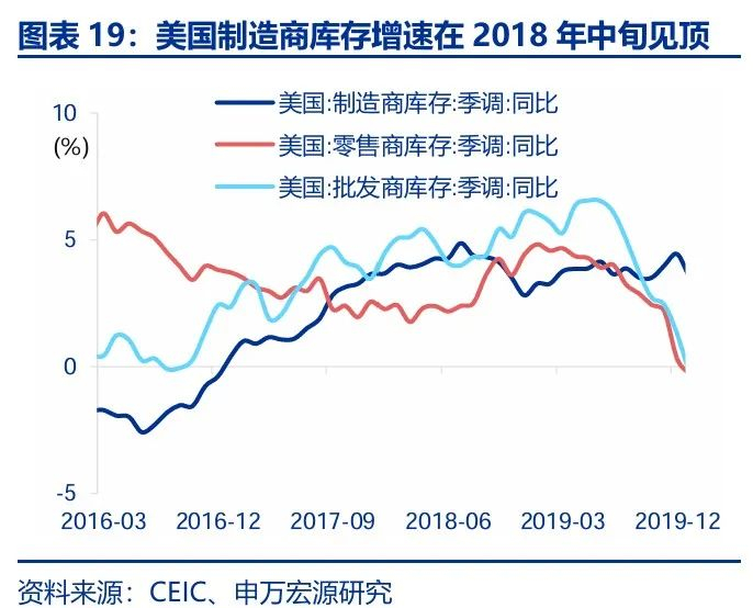 从2018-2019年期间的库存变动情况也能够看出,美国经济受外生性因素影响较大。美国名义库存增速在2019Q2见顶,随后回落,从结构上来看,美国制造商库存增速早在2018年中旬301关税落地时点已经见顶,而零售、批发库存均继续补库,显示经济内生性动能仍较强。