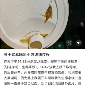 12月20日,有网友发视频爆料称,在瑞幸咖啡中喝出蟑螂。